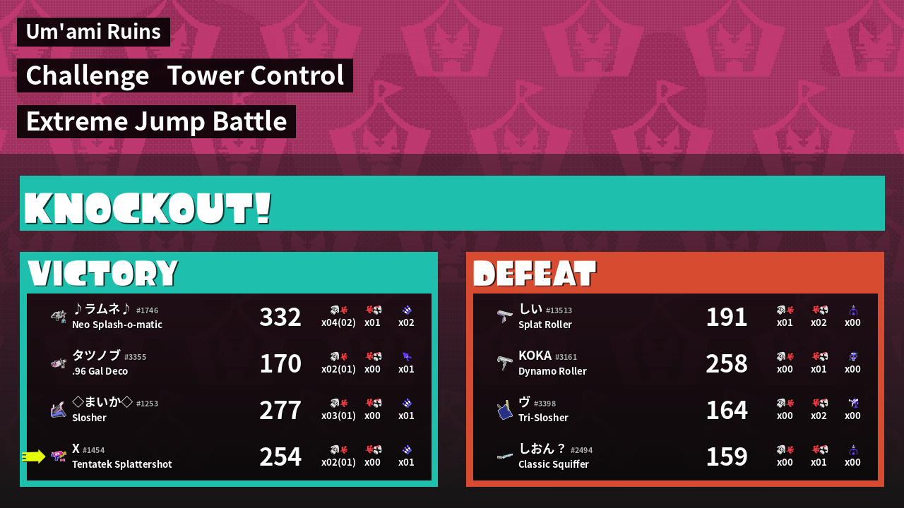 | Medals | #1 Ink Consumer #2 Splat Assister | ||