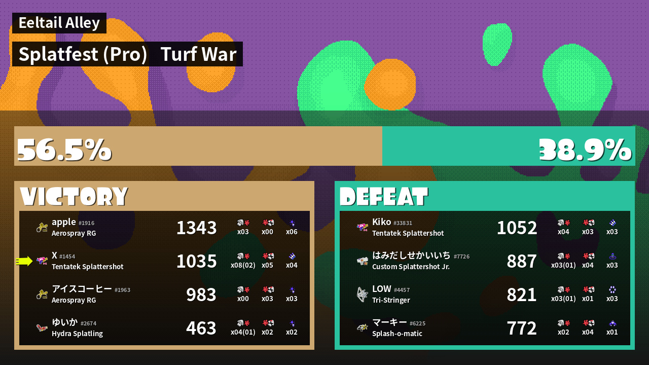 | Medals | #1 Overall Splatter #1 Popular Target #1 Enemy-Base Inker | ||