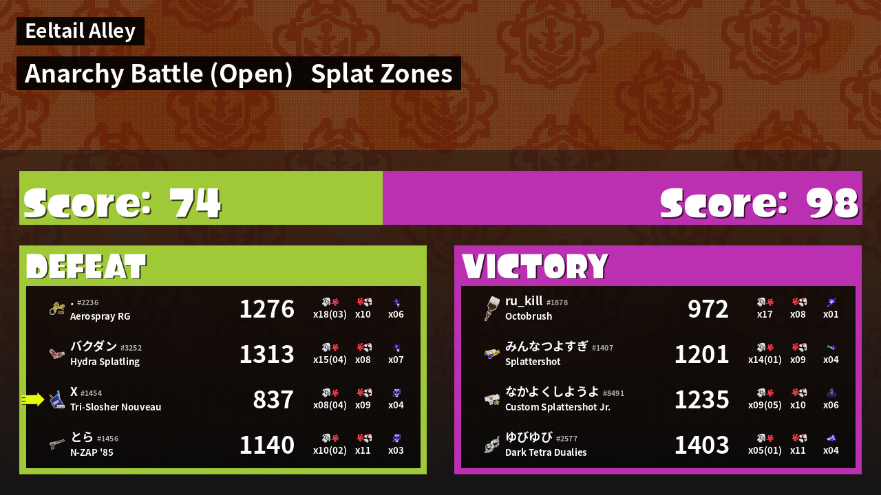 | Mode | Splat Zones - Anarchy Battle (Open) | ||