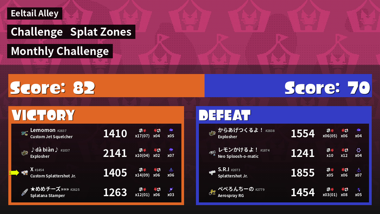 | Medals | #1 Splat Assister #1 Splat Zone Hero #1 Ink Consumer | ||
