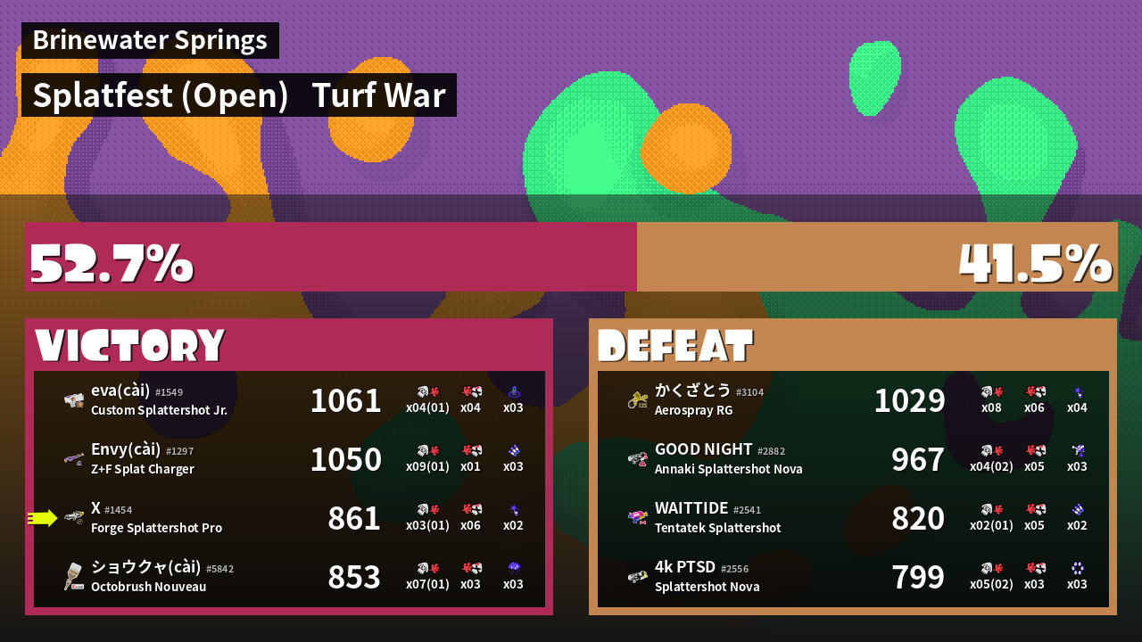 | Medals | #1 Splat Assister First Splat! #2 Popular Target | ||