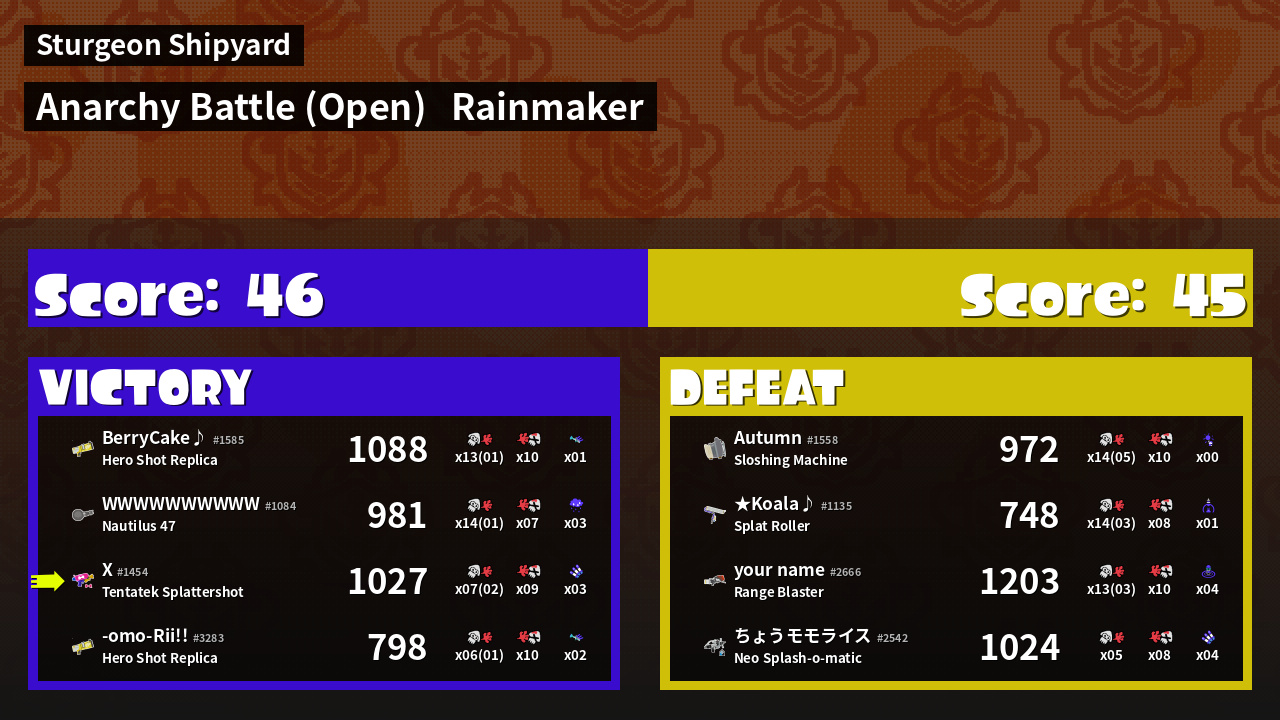 | Medals | #1 Super Jump Spot #1 Splat Assister #1 Rainmaker Stopper | ||