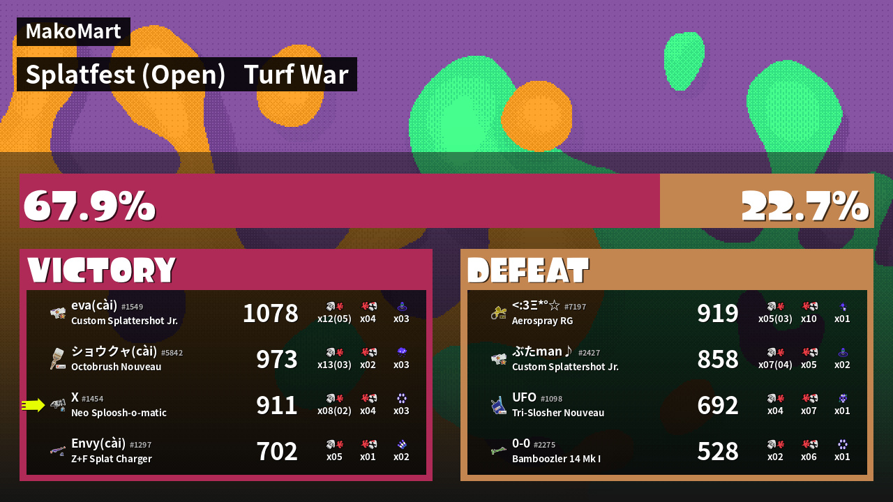 | Medals | #1 Enemy-Base Inker #1 Damage Taker #1 Killer Wail 5.1 User | ||