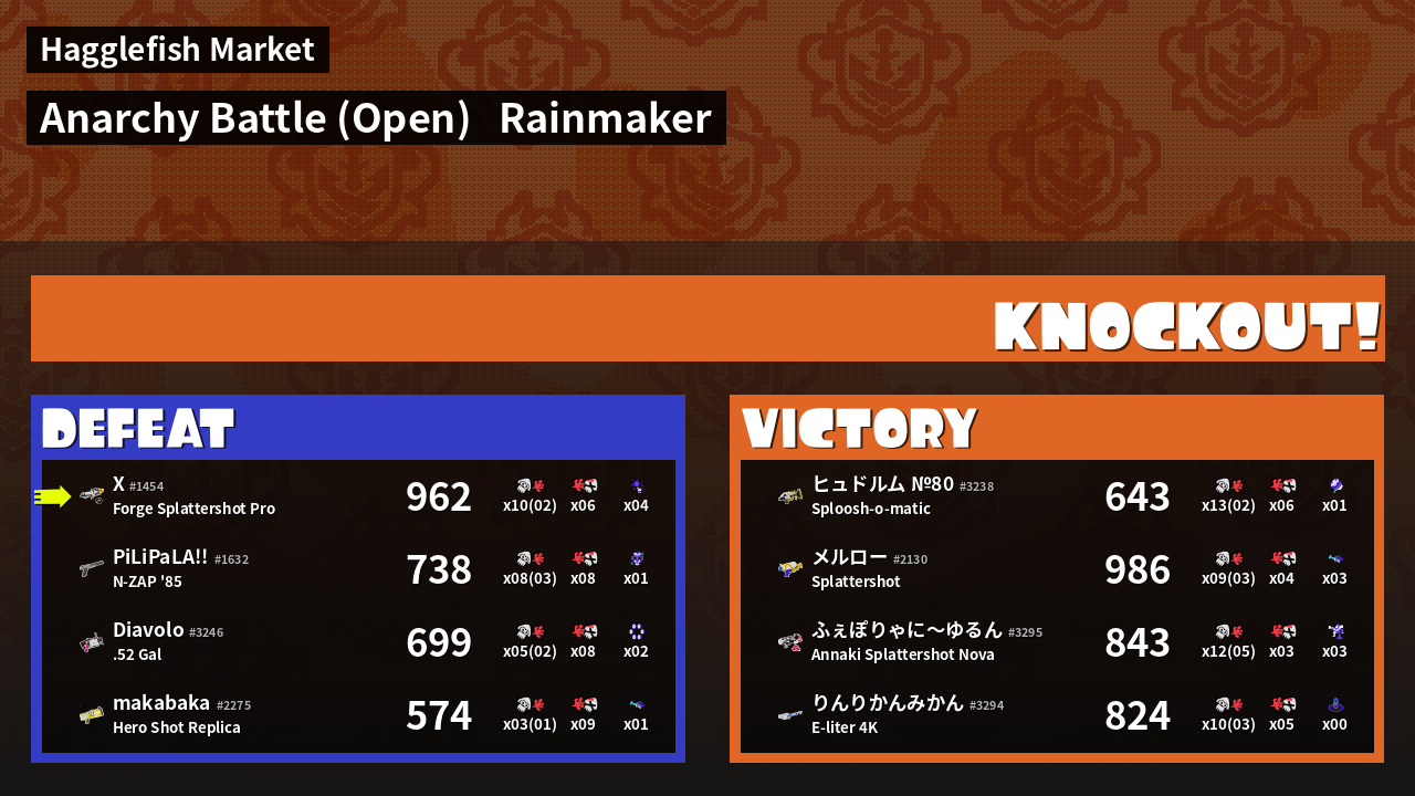 | Medals | #1 Overall Splatter #1 Turf Inker #1 Enemy Splatter | ||