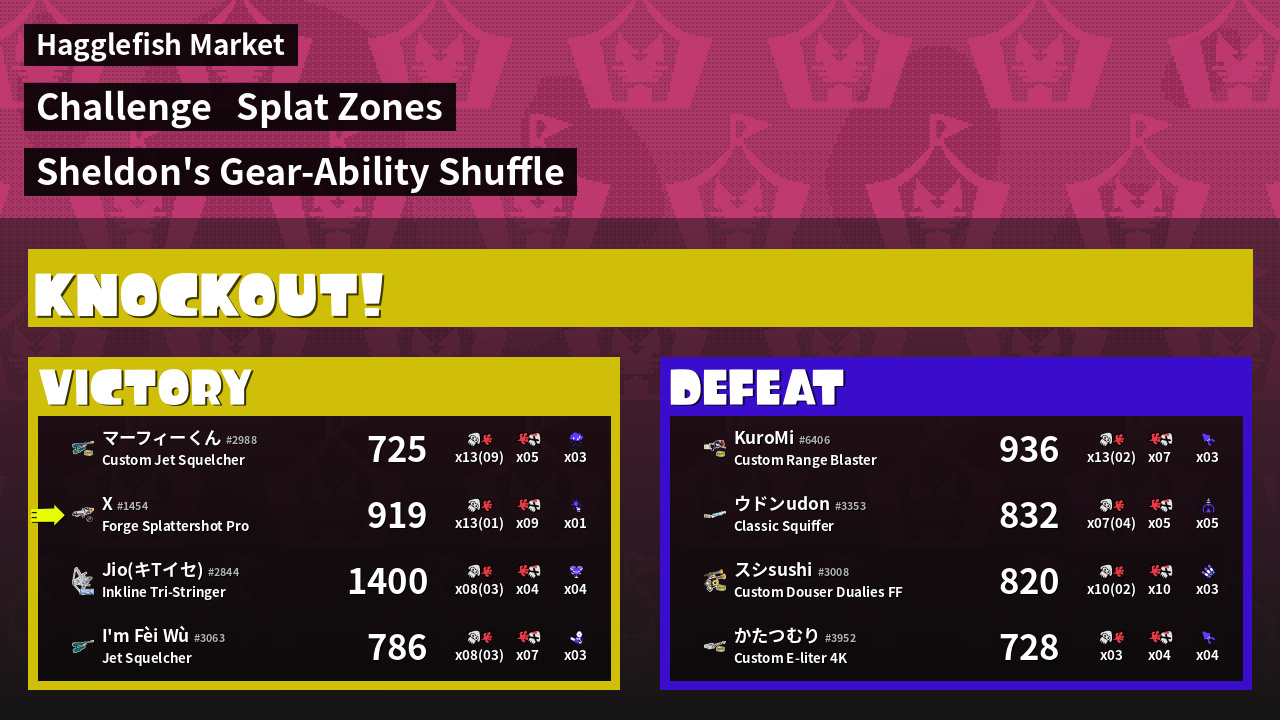 | Medals | #1 Overall Splatter #1 Splat Zone Guard #1 Enemy Splatter | ||