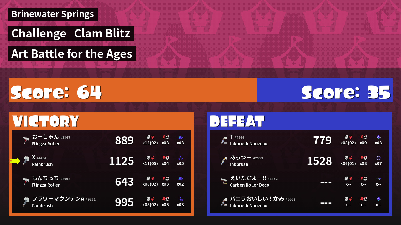 | Medals | #1 Clam Carrier #1 Turf Inker #1 Splat Assister | ||