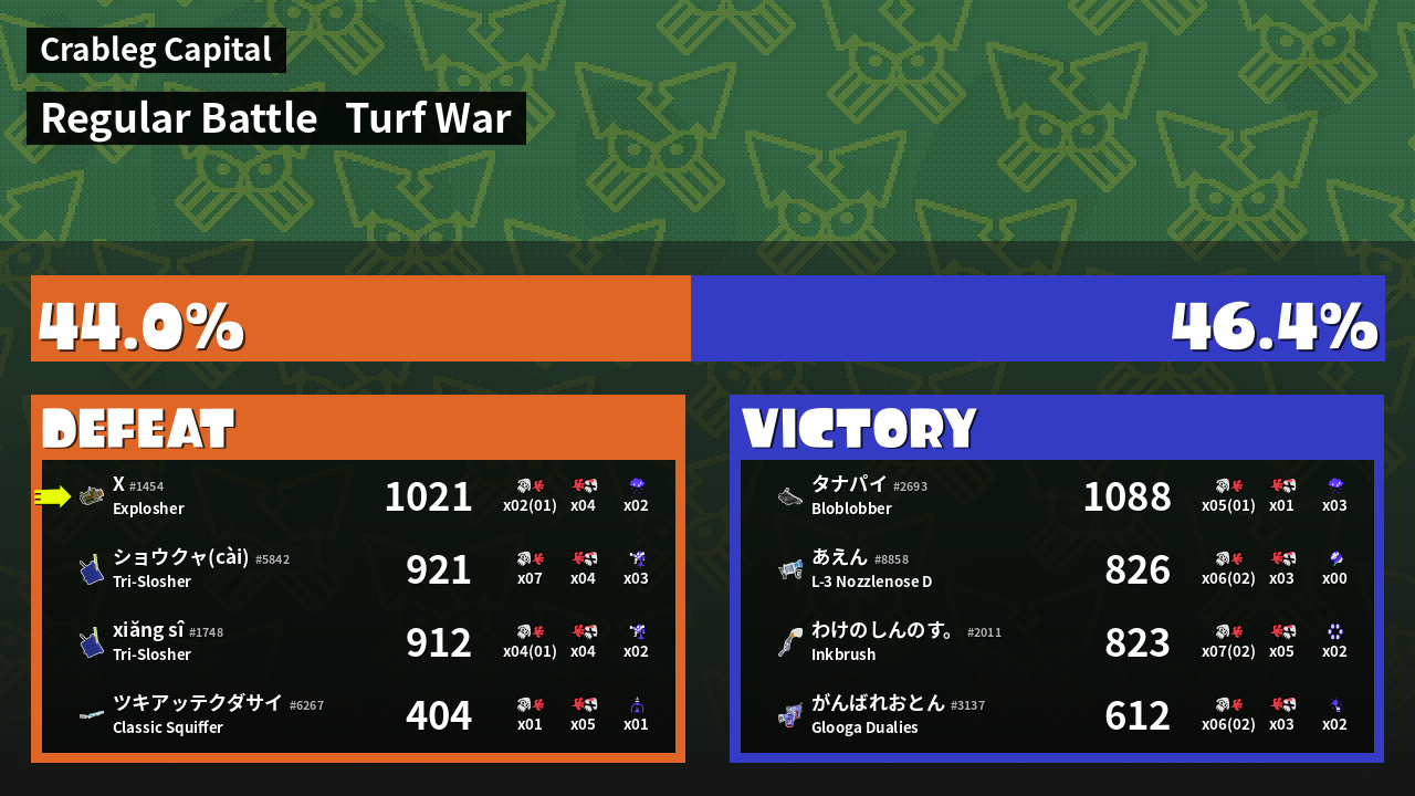 | Medals | #1 Turf Inker #1 Enemy-Base Inker #1 Splat Assister | ||