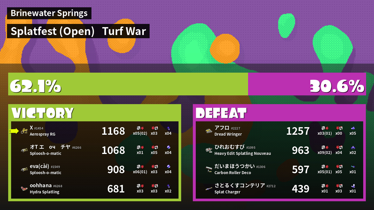 | Medals | #1 Turf Inker #1 Enemy-Base Inker #1 Splat Assister | ||