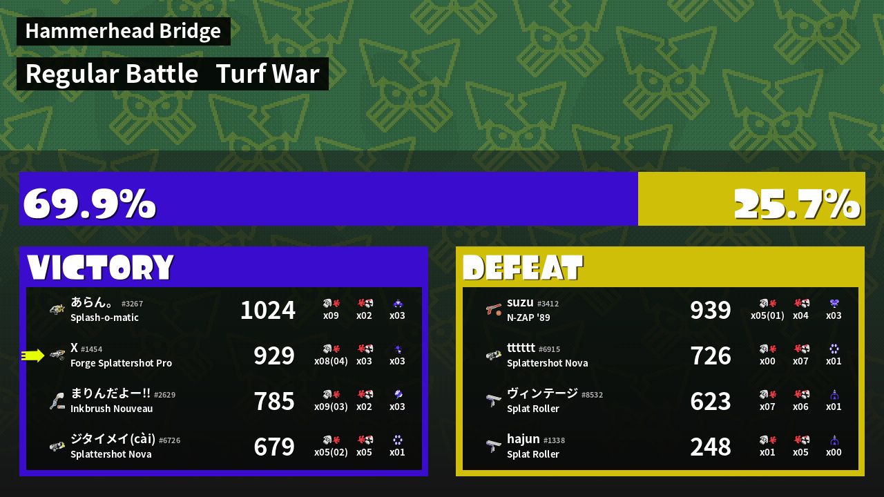 | Medals | #1 Splat Assister #1 Damage Taker #1 Ink Consumer | ||