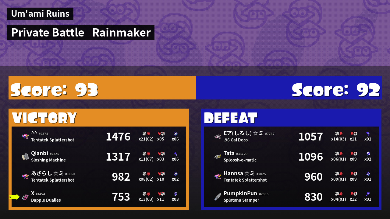 | Medals | #1 Rainmaker Stopper #1 Tacticooler User #2 Overall Splatter | ||