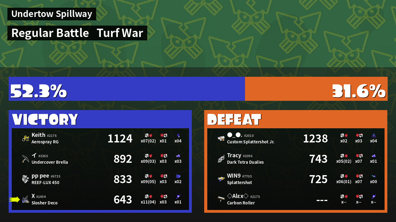 | Medals | #1 Overall Splatter #1 Enemy Splatter #1 Ink Consumer | ||