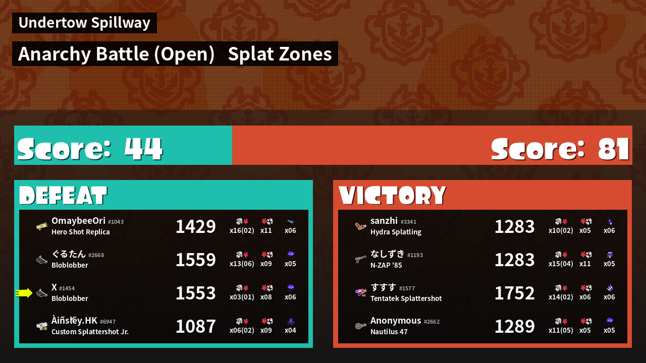 | Mode | Splat Zones - Anarchy Battle (Open) | ||