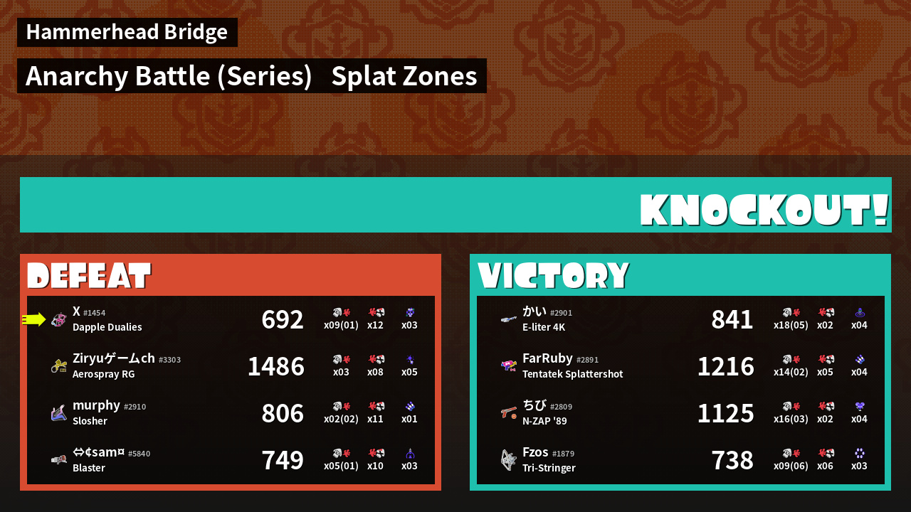 | Medals | #1 Overall Splatter #1 Splat Zone Guard #1 Enemy Splatter | ||