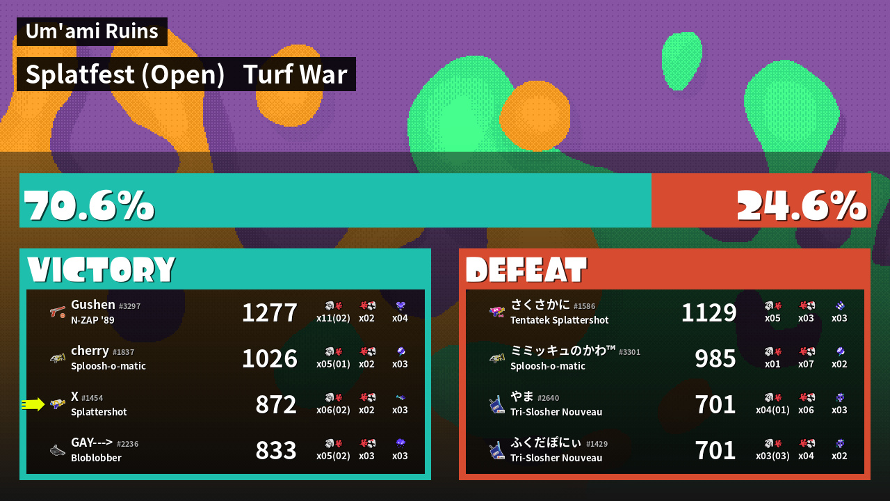 | Medals | #1 Splat Assister #1 Trizooka User #2 Overall Splatter | ||