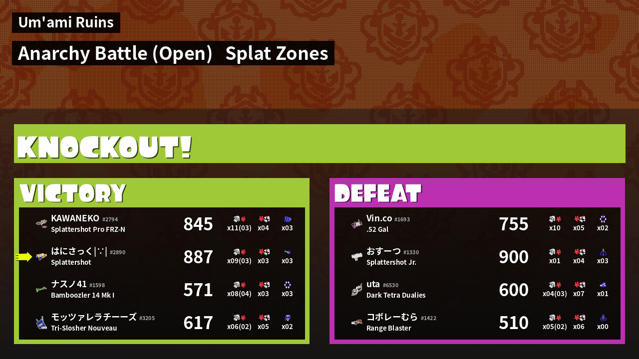 | Mode | Splat Zones - Anarchy Battle (Open) |