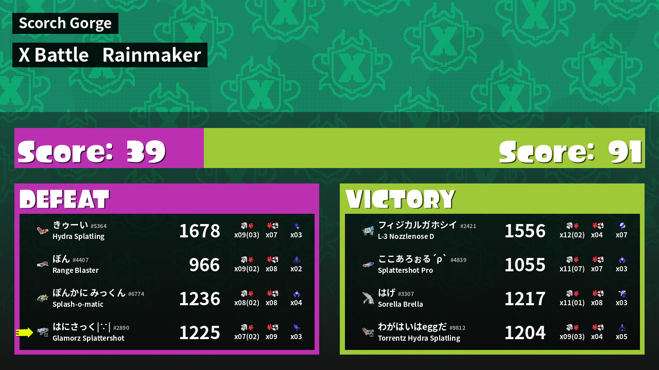 | Weapon | Glamorz Splattershot ( Burst Bomb / Kraken Royale) |