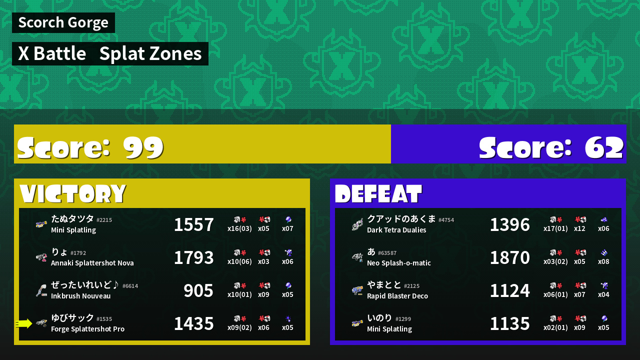 | Medals | #1 Splat Zone Hero #1 Ink Consumer #1 Booyah Bomb User |