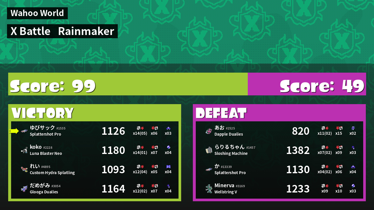| Weapon | Splattershot Pro ( Angle Shooter / Crab Tank) |