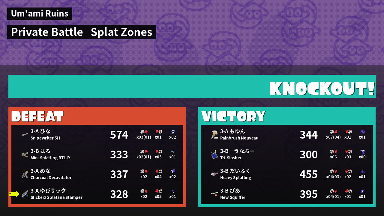 | Medals | #1 Enemy Splatter #1 Splat Zone Hero #1 Damage Taker |