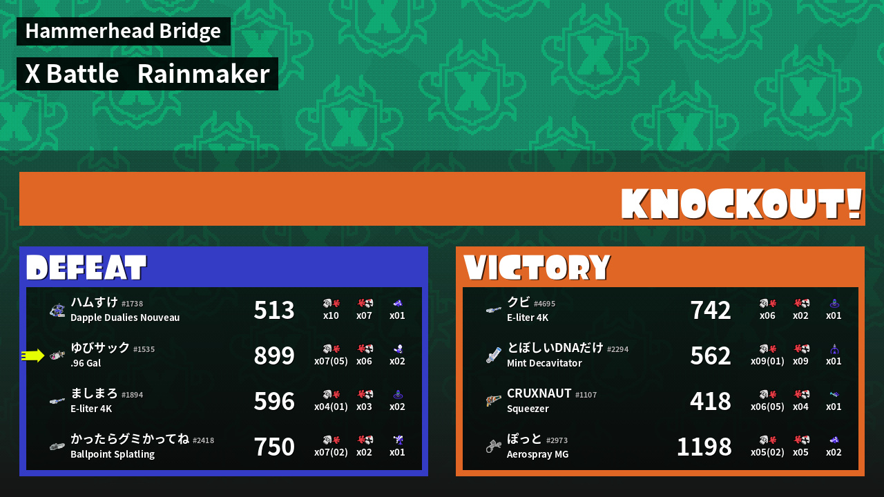 | Medals | #1 Turf Inker #1 Splat Assister #1 Rainmaker Stopper |