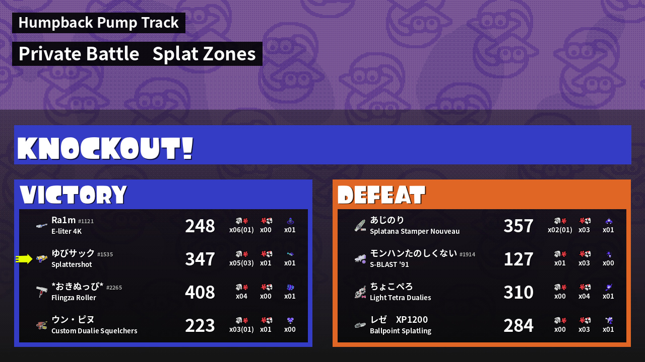 | Medals | #1 Splat Zone Inker #1 Splat Assister #1 Damage Taker |