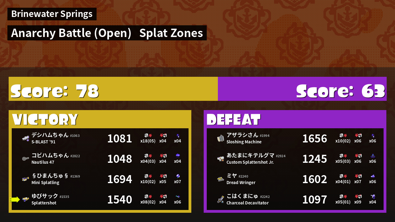 | Mode | Splat Zones - Anarchy Battle (Open) |