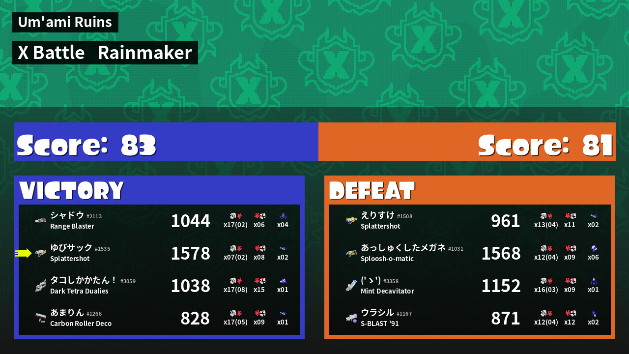 | Mode | Rainmaker - X Battle |