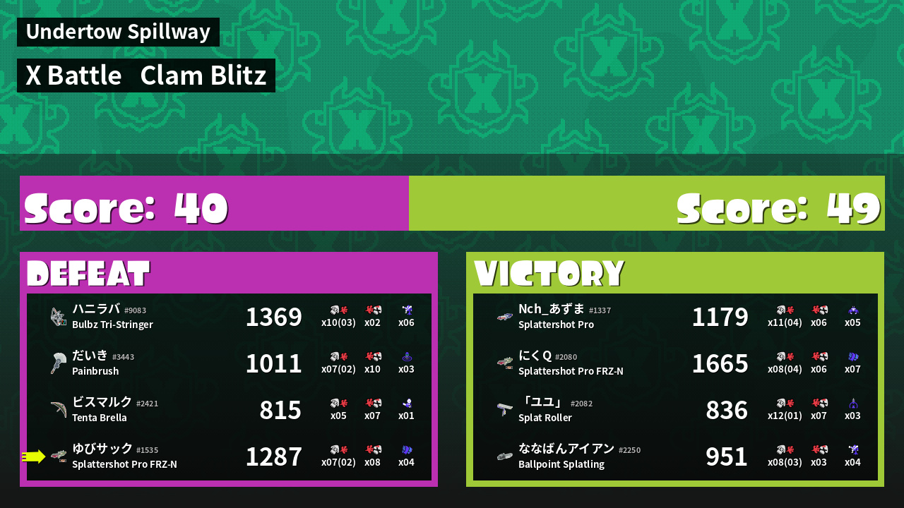 | Medals | #1 Damage Taker #1 Tenta Missiles User #2 Overall Splatter |