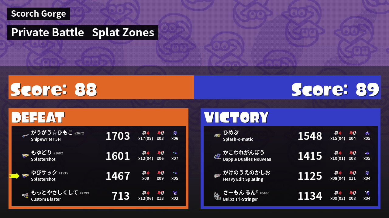 | Medals | #1 Enemy Splatter #2 Splat Zone Inker |