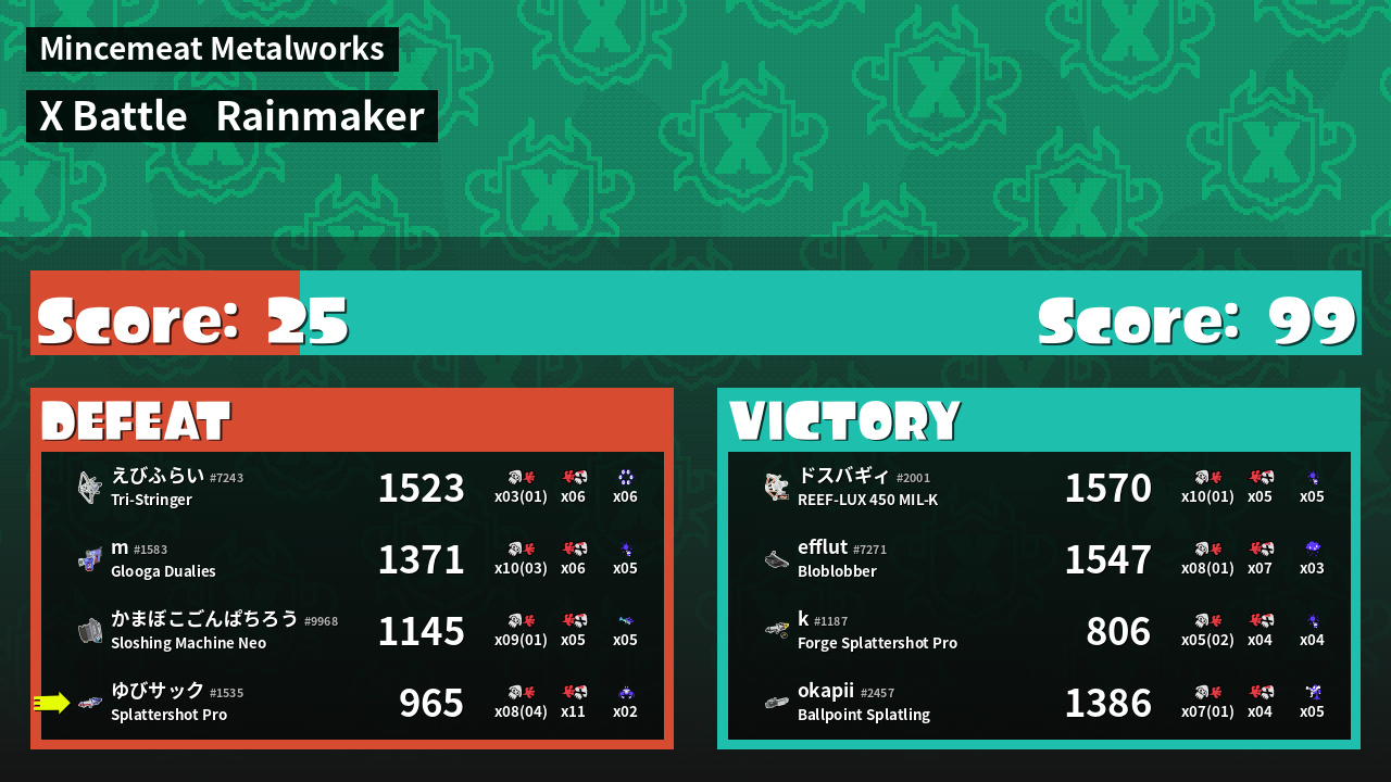 | Weapon | Splattershot Pro ( Angle Shooter / Crab Tank) |
