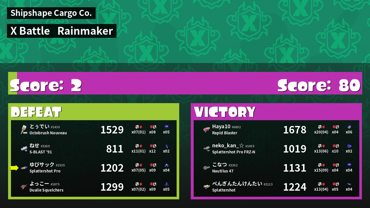 | Medals | #1 Splat Assister #1 Rainmaker Carrier #2 Overall Splatter |