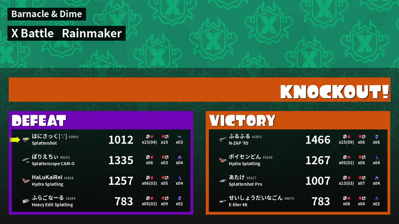 | Medals | #1 Overall Splatter #1 Enemy Splatter #1 Splat Assister |