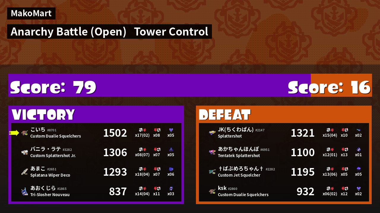 Kills / Deaths | 15 + 2 / 8 > Kill Ratio: 1.88 | ||
