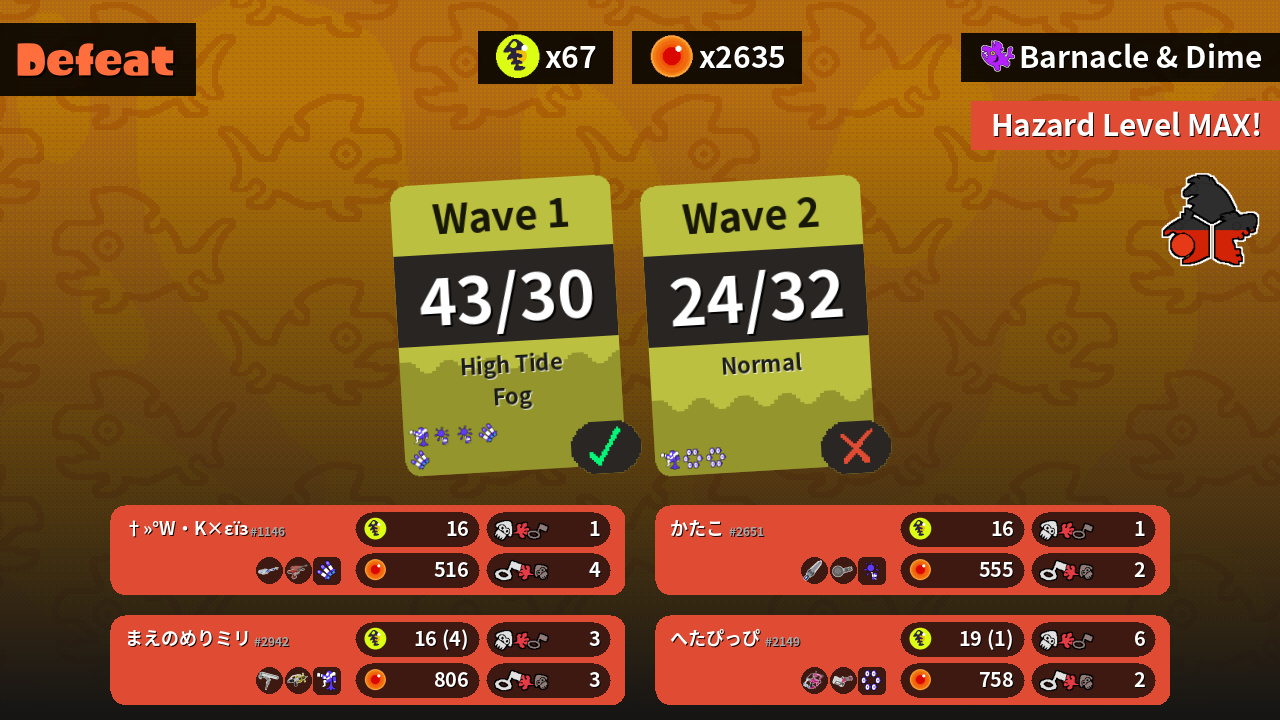 | Weapons | E-liter 4K Dualie Squelchers | Dapple Dualies Heavy Splatling | Dynamo Roller Splash-o-matic | Splatana Stamper Nautilus 47 |