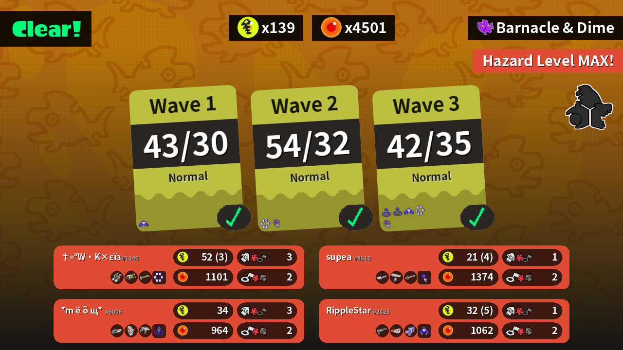 | Weapons | Splat Dualies Sploosh-o-matic Bamboozler 14 Mk I | Ballpoint Splatling Grizzco Stringer Grizzco Roller | N-ZAP '85 Goo Tuber Glooga Dualies | E-liter 4K Splat Roller Snipewriter 5H |