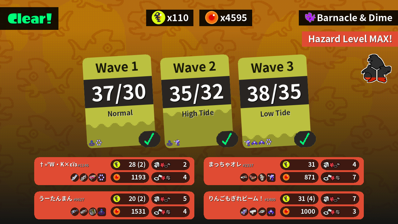 | Weapons | Mint Decavitator Dark Tetra Dualies Rapid Blaster | Glooga Dualies Splattershot Jr. Grizzco Brella | Range Blaster Hydra Splatling Grizzco Stringer | H-3 Nozzlenose S-BLAST '92 Grizzco Slosher |