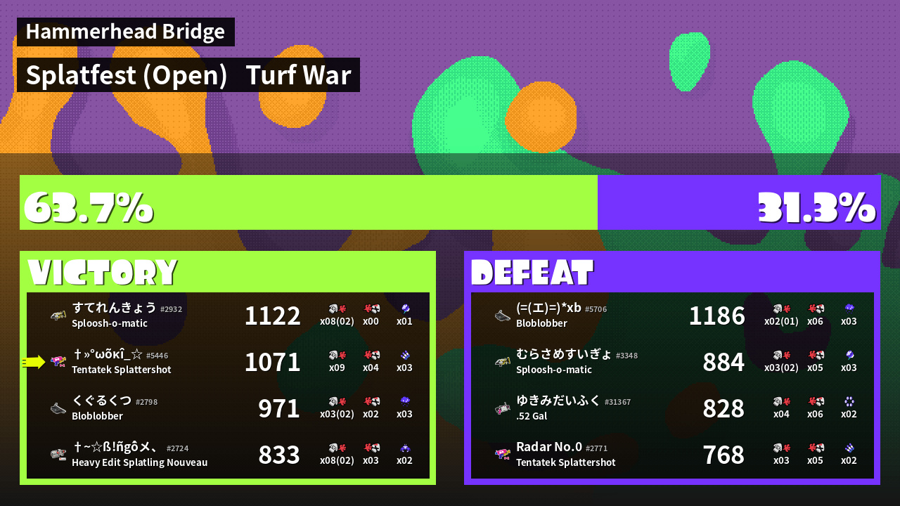 | Medals | #1 Overall Splatter #1 Enemy-Base Inker #1 Super Jump Spot | ||