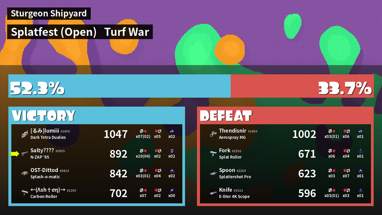 | Medals | #1 Overall Splatter #1 Popular Target #1 Super Jump Spot | ||