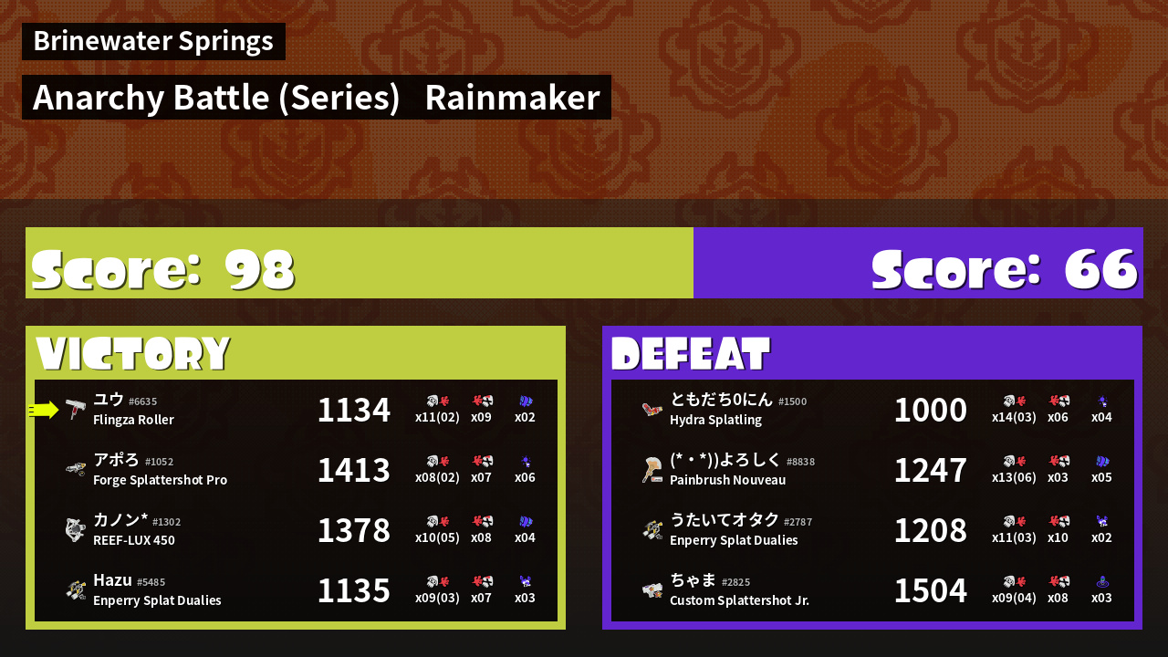 | Medals | #1 Overall Splatter #1 Super Jump Spot #1 Enemy Splatter | ||