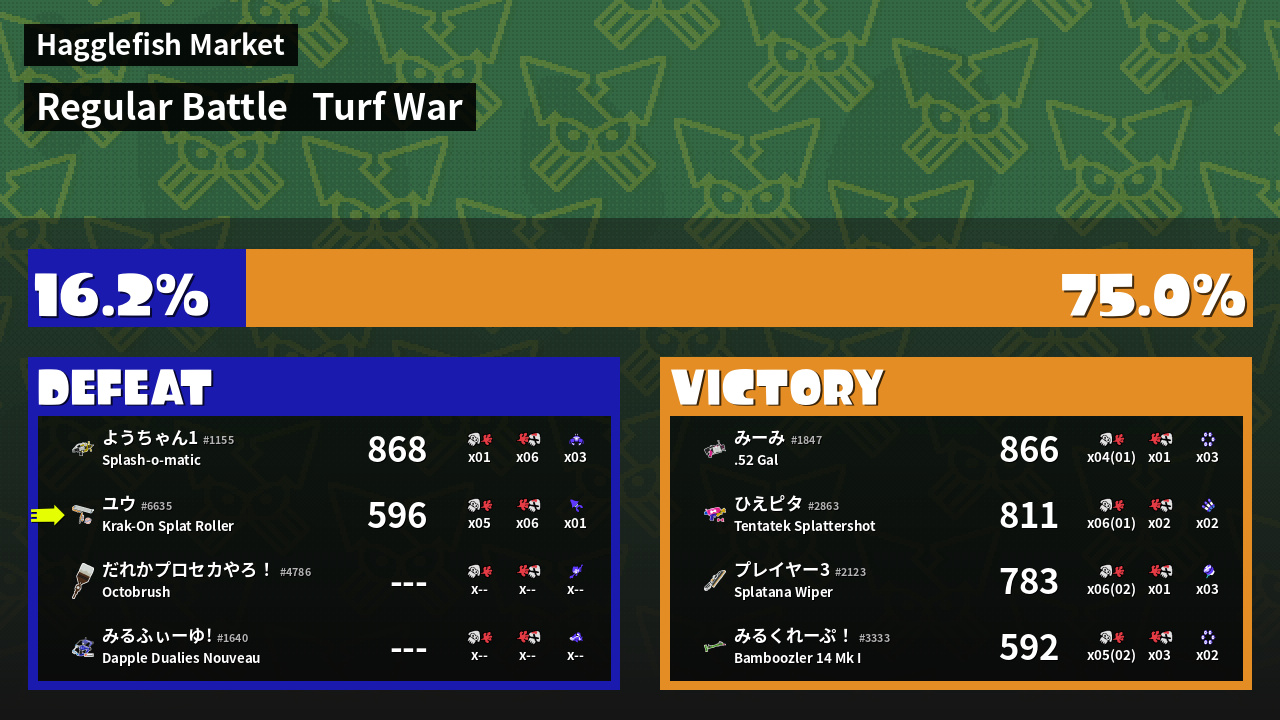 | Medals | #1 Overall Splatter #1 Enemy-Base Inker #1 Super Jump Spot | ||