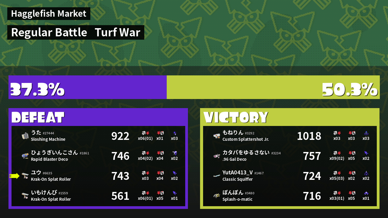 | Name | Weapon | Inked |  k |  d | KR | Sp | |