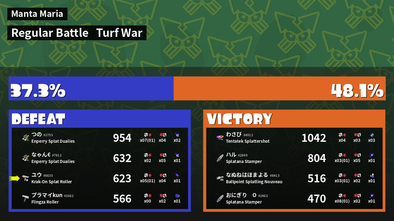 | Overpowering Teardrop  わさび #4912 |  Tentatek Splattershot                    | 1,042 | 4 + 0 | 3 | 1.33 |  3 | |