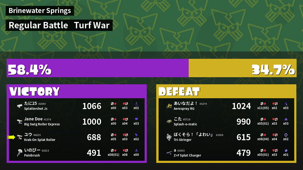 | Fully Clubgoer たに25 #2449 |  Splattershot Jr.                    | 1,066 | 0 + 0 | 3 | 0.00 |  2 | |