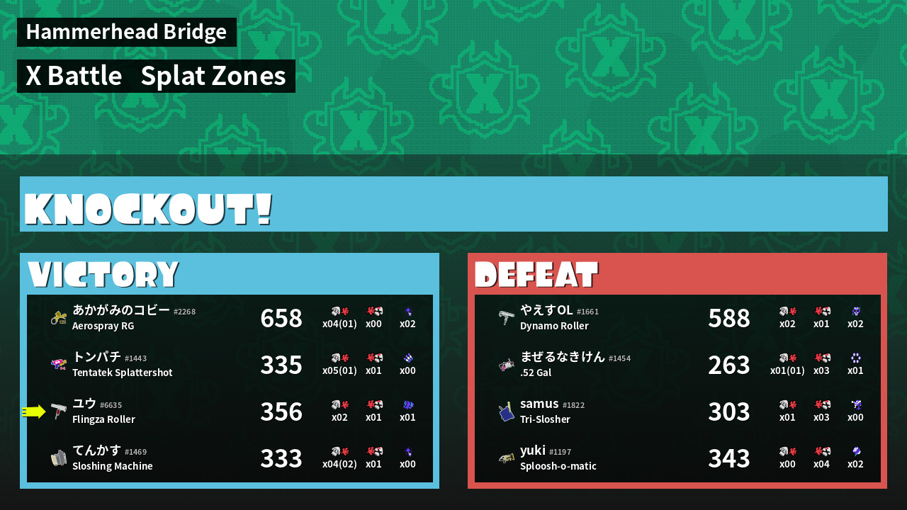 | Glimmering Splattershot User トンパチ #1443 |  Tentatek Splattershot                    | C- | 335 | 4 + 1 | 1 | 4.00 |  0 | |
