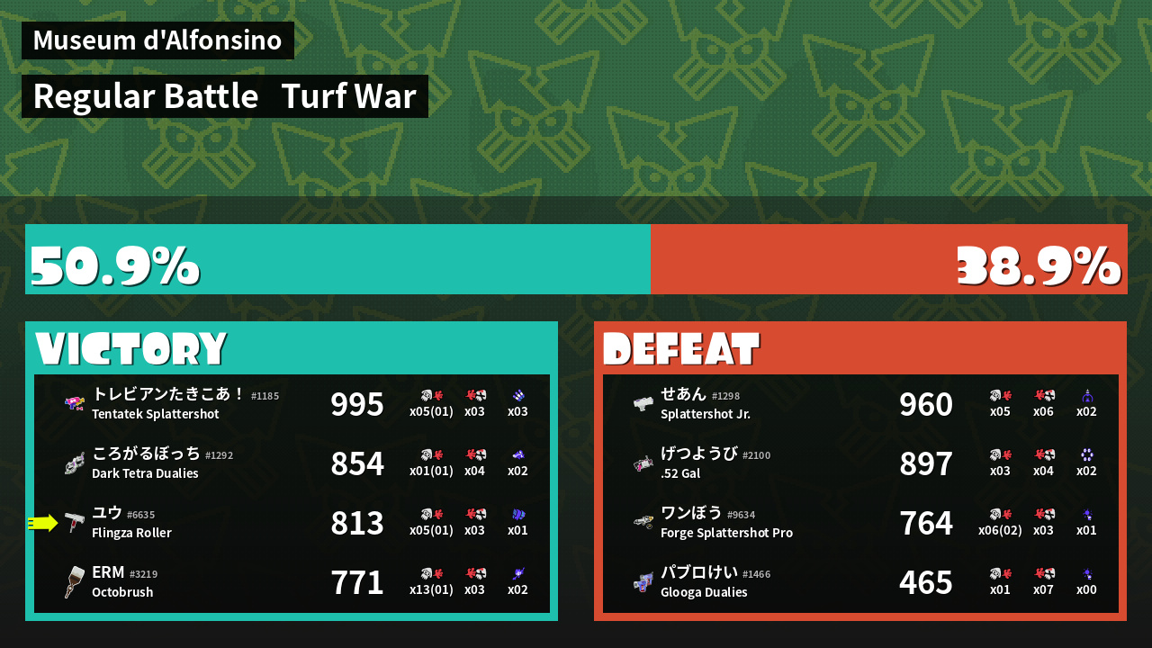 | Medals | #1 Enemy-Base Inker #1 Splat Assister #1 Tenta Missiles User | ||