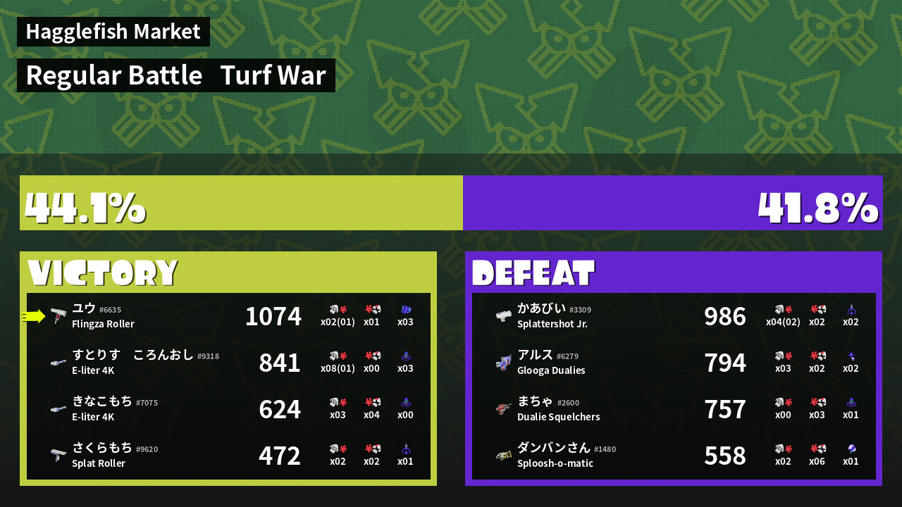 | Medals | #1 Turf Inker #1 Enemy-Base Inker #1 Splat Assister | ||