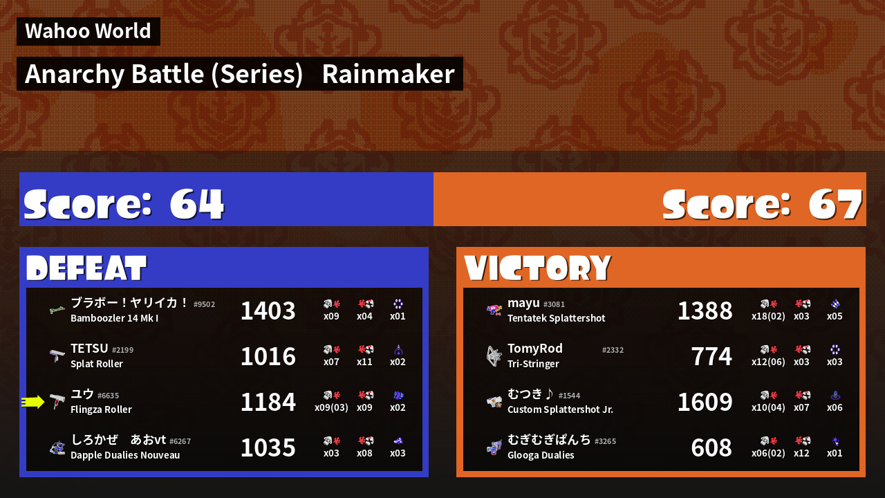 | Medals | #1 Overall Splatter #1 Splat Assister #1 Checkpoint Breaker | ||