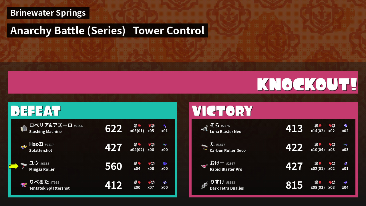 | Splatlandian Youth りべるた #7955 |  Tentatek Splattershot                    | 412 | 0 + 0 | 7 | 0.00 |  0 | |