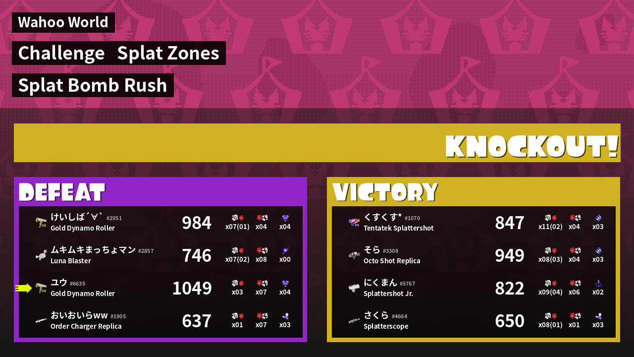 | Challenge | Splat Bomb Rush Let the Splat Bombs fly in this free-for-all!  | ||
