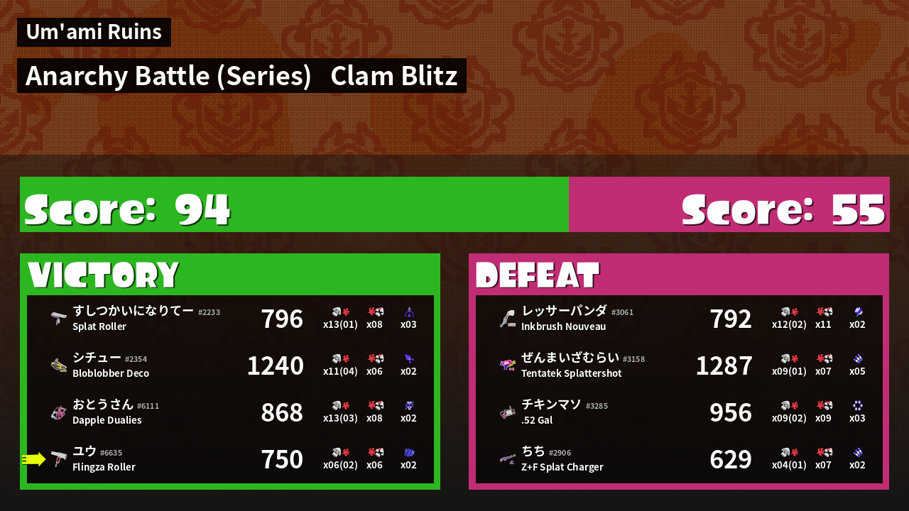 | Ancient Daredevil  すしつかいになりてー #2233 |  Splat Roller                    | 796 | 12 + 1 | 8 | 1.50 |  3 | |